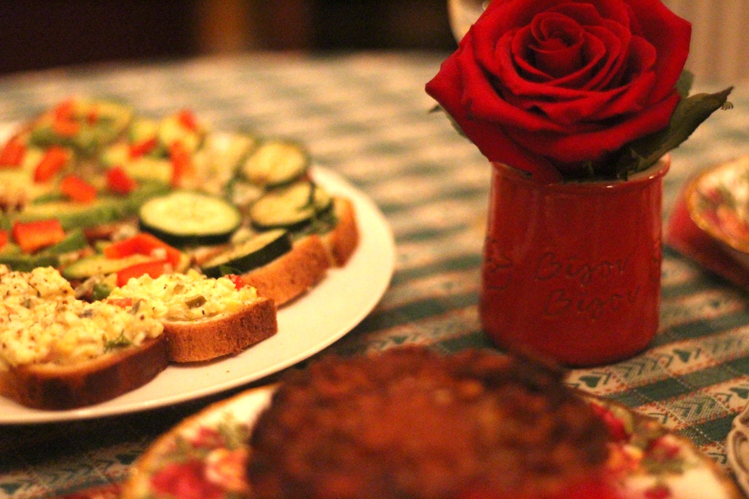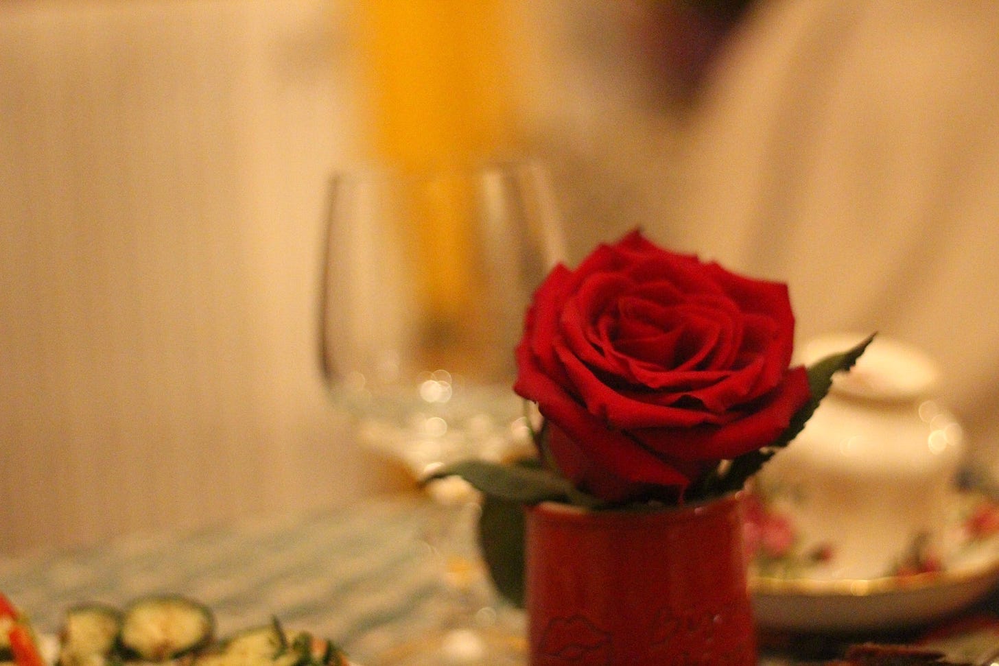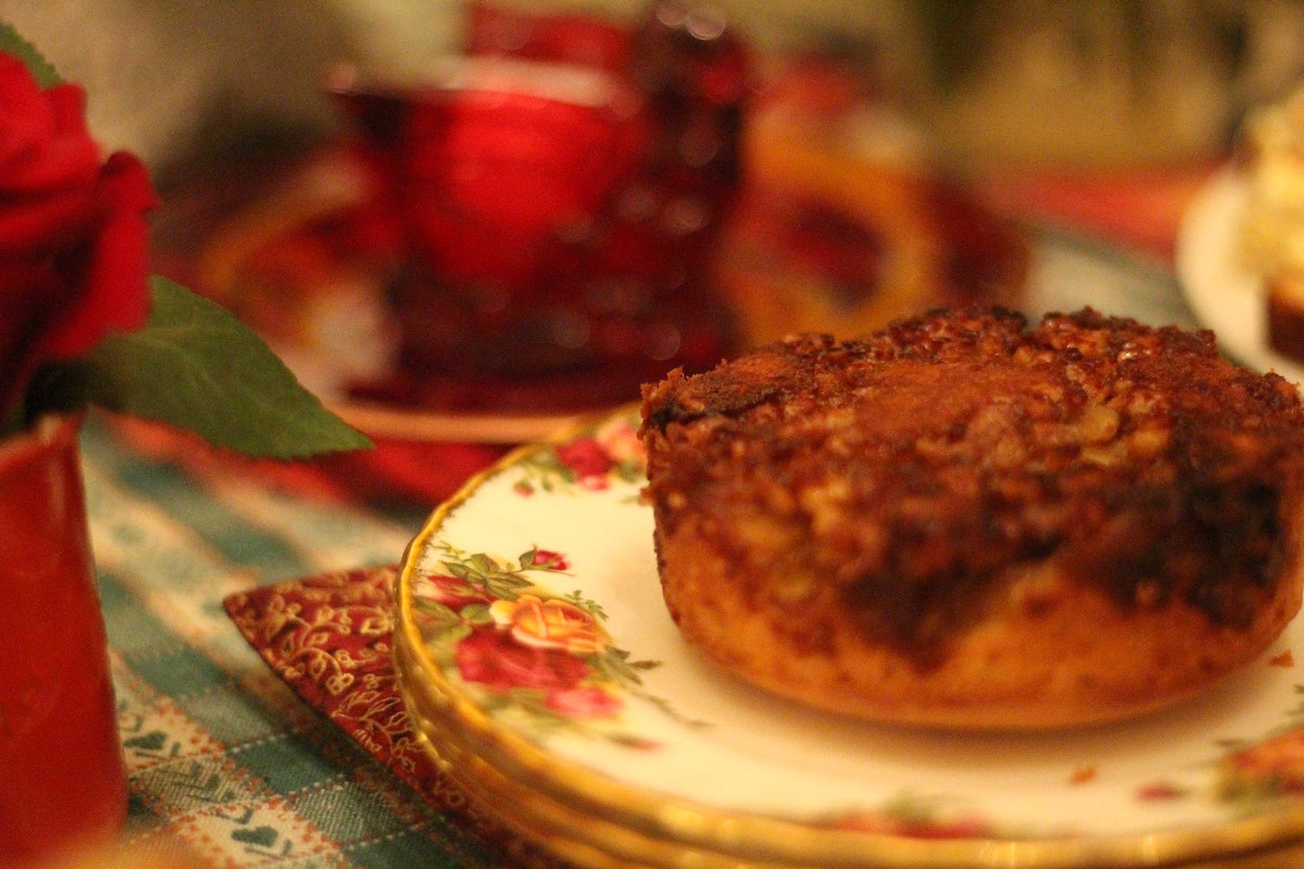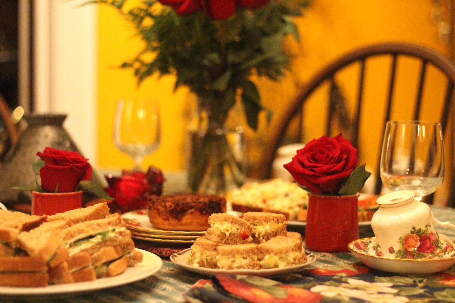 I set the table with my girls’ morning roses, our Royal Albert “Country Roses” teacups and plates, the crimson bird votive candle from my mom’s place, and clear glass goblets.